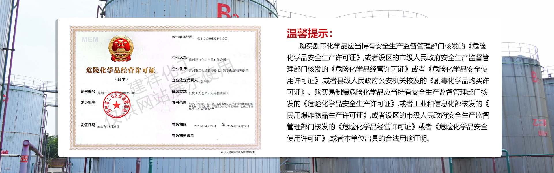 鄭州建祥化工產品有限公司 位于河南鄭州市,主營石油級二甲苯、石油級混苯、甘油、乙二醇、甲醇等。公司秉承“顧客至上,銳意進取”的經營理念,堅持“客戶第一”的原則為廣大客戶提供優質的服務。創建于1991年,是由市科協幾位專家聯合創建的化工研究機構,2001年發展為科工貿為一體的科貿公司,本公司研發的化學復合甘油曾獲93年國家發明獎,該產品以多元醇為基料,采用新工藝縮合法生產的,現己規?;a。...